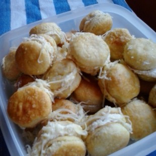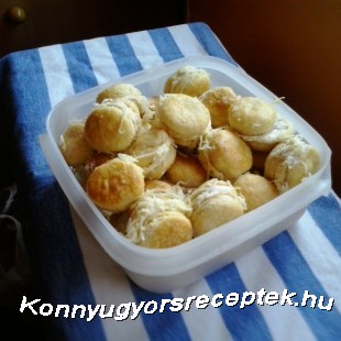 A hűtőből kivett tésztát kinyújtjuk 2-3 mm vastagságúra, majd kicsi kör alakú szaggatóval kiszurkáljuk. A kis korongokat tepsibe tesszük és tetejüket tojás sárgával lekenjük. Előmelegített 180 c sütőben kb 15 percig sütjük. Ha kihűltek a korongok 2 közzé krémet töltünk, és reszelt sajtba forgatjuk oldalát.