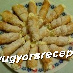 Ezzel a sajtkrémmel megtöltjük a kihűlt rolókat habzsák segítségével úgy, hogy mindkét végén legyen bőségesen a krémből, majd pedig mindkét oldalát belemártjuk a fennmaradó reszelt sajtba.