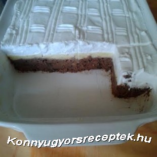A tésztához valókat összeállítjuk, s egy kb. 20x30 cm-es tepsibe nyomkodjuk. Rásimítjuk a simára kevert pudingot, majd a tetejére simítjuk a felvert cukrászhabot.