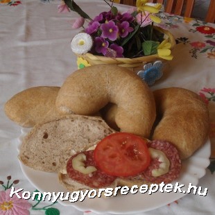 Az élesztőt kis langyos vízben felfuttatjuk, majd a többi hozzávalóval rugalmas ?kissé lágyabb- tésztát gyúrunk. ( én dagasztó gépbe teszem). Kiolajozott kelesztőtálba tesszük, és hűvös helyre ( spajzba) tesszük egy éjszakára. Másnap reggel 8 darabba vesszük, ovalisra nyújtjuk, olajjal megkenjük, feltekerjük, és sütőpapírral bélelt tepsibe tesszük. Ismét kelesztjük, majd 220 C fokos sütőben ( gőzös) szép pirosra sütjük.