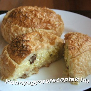 Elkészítjük a tölteléket: a cukrot a tojással kikeverjük, az áttört túrót és a kivett zsemlebelet hozzámorzsoljuk és jól elkeverjük. A mazsolát a pohárban átmossuk és a túróhoz adjuk.