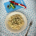 Legelőször a tésztát főzöm ki, majd megpárolom a zöldségkeveréket, amit csak a párolás után sózok meg, a zöldségek megkeményedésének elkerülése végett. Közben feldarabolom a csirkemellsonkát és a lila hagymát, majd ...