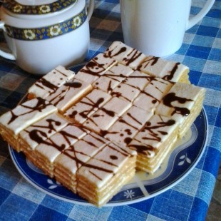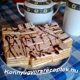 Krém: A tejből és a lisztből sűrű cinkét főzünk és kihűtjük. A 25 dkg margarint a 25 dkg porcukorral és vaniliás cukorral habosra keverjük. Ha a cinke kihűlt az egészet összekeverjük és megkenjük vele a lapokat. A tetejét csokoládé mázzal díszítjük.