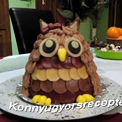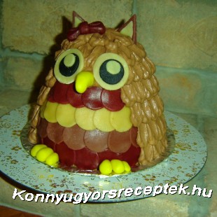 1.Marcipán masszából elkészítjük a szemeket,a csőrét,fülét,masnit,karmokat és a hasán lévő tollazatot. Vagy színezett marcipánt vásárolunk,vagy mi magunk 1-1 csepp vagy 1-1 késhegynyi színezővel megszínezzük.Attól függ,hogy folyadékkal vagy porral dolgozunk. A szemekhez és a hason lévő tollazathoz a marcipánt vékonyra kinyújtjuk ,majd különböző átmérőjű kerek szaggatóval kiszúrjuk.A füleihez szintén vékonyra nyújtjuk és háromszög alakra vágjuk. A karmokat csőrt és a masnit megformázzuk.