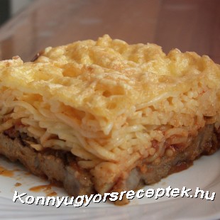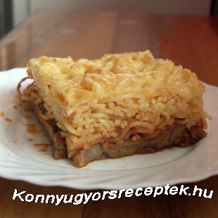 A kifőtt tésztát összekeverjük a tejföllel, a vajjal és a tojással, majd befedjük vele a paradicsomos húst. Végezetül 15 dkg reszelt sajttal megszórjuk.