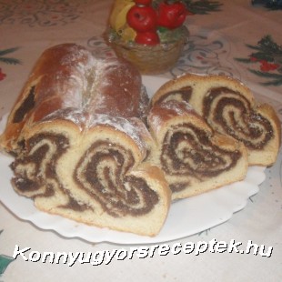 A megkelt tésztát egy lisztezett abroszon kinyújtjuk kb. 50-55 cm x 35-40 cm szélességűre, megkenjük a diós töltelékkel, és az abrosz segítségével a hosszabbik oldalánál feltekerjük, mint a bejglit. Sütőpapírral bélelt formába tesszük, úgy , hogy félbehajtjuk. Ismét kelesztjük. Tetejét a maradt tojásfehérjével megkenjük, és 180 C fokos sütőben 15 percig, majd 150 C fokos sütőben további 45 percig sütjük. Rácson hagyjuk kihűlni.