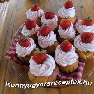 Felverjük a tejszínt habbá, majd hozzáadjuk az eperpürét, habzsákból feldíszítjük a muffinokat. Tetejüket félbevágott eperrel díszítjük.