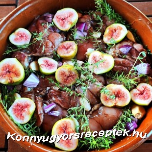 3. Egy sütőtálat kikenünk az olivaolajjal, majd szépen elrendezzük bennne a húst az elnegyedelt lilahagymával, a fokhagymákkal, az elfelezett fügékkel és a friss kakukkfű ágakkal, majd egy kiskanálnyi mézzel meglocsoljuk.