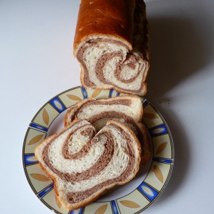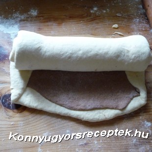 A fehér tésztára rátesszük a kakaósat. A két hosszabb szélét egy kicsit behajtjuk és lenyomkodjuk, a rövidebb oldala felől feltekerjük.