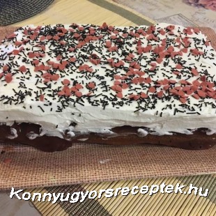A tejszínhabot felverjük keményre. Ha kihűlt a tészta, rákenjük a krémet, a tetejére simítjuk a habot, végül a tetejét megszórjuk reszelt csokoládéval vagy cukordekorral.