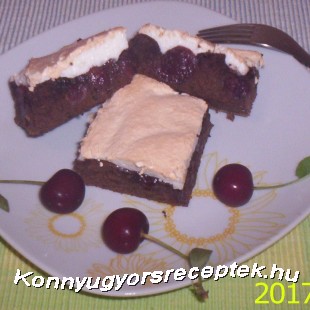 A kész piskótát belesimítjuk a tepsibe,majd a darált dióba mártott meggyel kirakjuk .