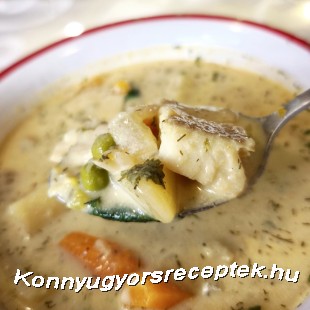 4. Ha megpuhultak, beleöntjük a tejszínt, a zöldborsót, sózzuk-borsozzuk és beletesszük a kb 5x5 centis kockákra vágott átsütött tőkehalat. Folytonos keverés mellett további 15 percig főzzük, végül belefacsarjuk egy fél citrom levét. Friss petrezselyemlevéllel tálaljuk.