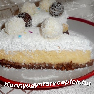 Megszórjuk kókuszreszelékkel és a két féle golyókkal díszítjük.