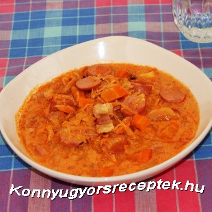 Amikor a zöldségek és a káposzta puhára főttek, adjuk hozzá a felkarikázott virslit is.