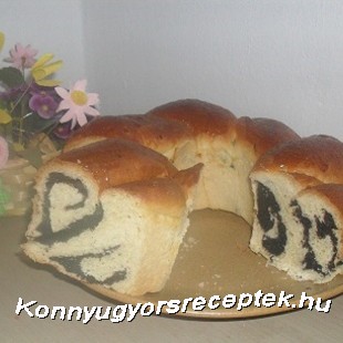 Ha a tészta megkelt, kétfelé vesszük, hosszú keskeny tésztát nyújtunk belőle, megkenjük a töltelékkel, felcsavarjuk,mint a bejglit, majd a két szálat összetekerjük. Egy 26 cm-es kuglóf formát vajjal kikenünk, és belefektetjük a tésztát. Ismét kelesztjük. Ha megkelt tojással lekenjük, majd 180 C fokra előmelegített sütőbe téve, szép pirosra sütjük. ( kb. 45-50 perc, a felénél le lehet takarni alufóliával, hogy ne égjen meg a teteje.) Még melegen megkenjük forró baracklekvárral, és rácson hagyjuk kihűlni.