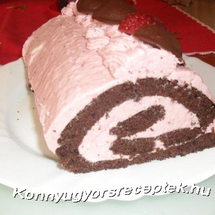 A krémhez hozzáadjuk az epret, majd óvatosan össze keverjük. Kicsavarjuk a papírból a tésztát, majd egyenletesen megkenjük az epres krémmel. Ezután óvatosan felcsavarjuk, majd a félretett krémmel bevonjuk a külsejét is. Ezután a félretett, olvasztott csokoládéba mártott eperszemekkel kidíszítjük. Végül a hűtőbe tesszük, hogy a krém kellően megdermedjen.