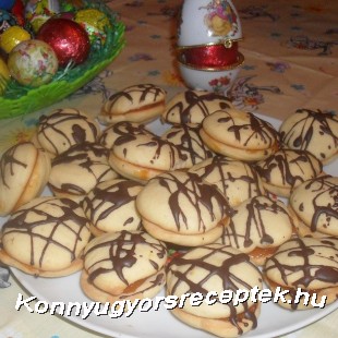A vaj, cukor, porcukor, vaníliás cukor habosra keverve, egyesével hozzáadjuk a tojásokat. Végül a lisztet óvatosan hozzá keverjük. Nyomózsákból ( vagy kiskanállal) kis halmokat nyomunk egy sütőpapírral bélelt tepsire. 180 C fokos sütőbe téve kb. 10-12 percig sütjük. Ha kihűlt egyet-egyet lekvárral összeragasztunk, majd olvasztott csokival " becsíkozzuk".