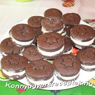 Nem túl vékonyra nyújtjuk, kb. 5 cm-es pogácsa szaggatóval kiszúrjuk, minden második tetejét egy mintával megnyomjuk. Sütőpapírral bélelt tepsibe téve, 160 C fokos sütőben kb. 7-8 percig sütjük. Ha kihűlt a krémmel összeragasztjuk a kekszeket.