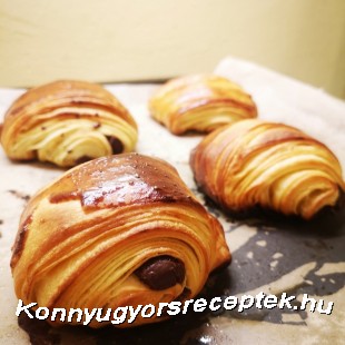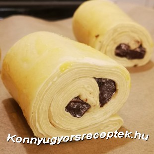 8. Pihentetés után lisztezett deszkán kb 30x30 cm-es kockára nyújtjuk, átporoljuk lisztes ecsettel, széleit egy éles késsel picit levágjuk hogy látszódjanak a tészta rétegei és egymás alá függőlegesen elhelyezünk 4 db csokirudat. Alattuk hosszában elvágjuk a tésztát, így mind a 4 csokirúd megkapja a saját tészta szalagját.