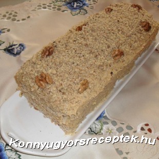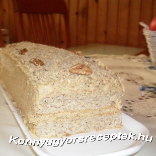 A piskótát hosszában kettévágjuk, megtöltjük a fele krémmel, rákerül a másik lap, azt is megkenjük krémmel, úgy hogy maradjon az oldalára is. A tetejét megszórjuk darált dióval.