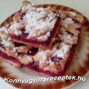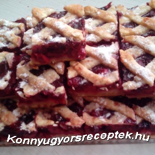 A tésztára szórjuk a grízt, hogy a meggy levét felvegye. Majd a kinyomkodott, becukrozott meggyet rászórjuk, s majd a maradék tésztából kis vékony rudakat formázunk és ráhelyezzük a meggyre, mint rácsos formát. A rácsokat bekenjük 1 tojás sárgájával.