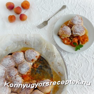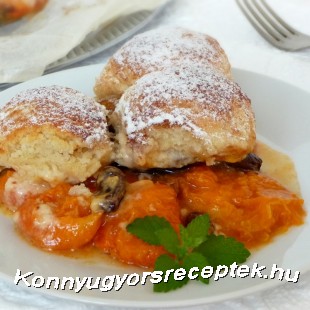 Ezután lisztezett kézzel formáljunk a tésztából diónyi golyókat, majd fedjük be vele a gyümölcs tetejét. (nem baj ha nem érnek össze a tésztagolyók, mert sütés közben megfognak nőni)