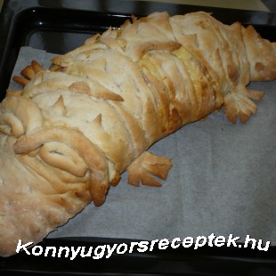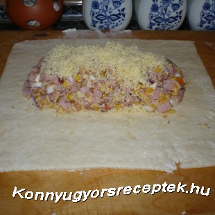A tésztát kinyújtjuk, derelyevágóval körbe vágjuk. A közepére egy csíkban belerakjuk a tölteléket. A széleit a vágóval bevagdaljuk. Ráhajtogatjuk.