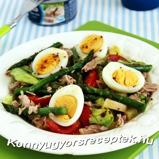 Végül helyezzük rá a félbevágott főtt tojást, majd locsoljuk meg a maradék öntettel, és úgy kínáljuk.
