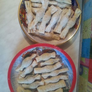 Rátesszük a tölteléket, fehérjével megkenjük a kis téglalapok széleit. Feltekerjük és a két végét jól összenyomjuk, majd a végeket bevágjuk (hogy úgy nézzen ki mint a szaloncukor két vége).