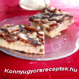 A tészta hozzávalóit összegyúrjuk és kétfelé vesszük. Az egyik tésztacipót kinyújtjuk, hogy beleférjen egy közepes tepsibe, rásimítjuk a krémet, majd befedjük a másik lappal.