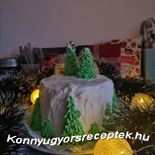 A végén megintjük a tortát áttetsző ehető csillámmal és a fenyőket porcukorral hintjük.