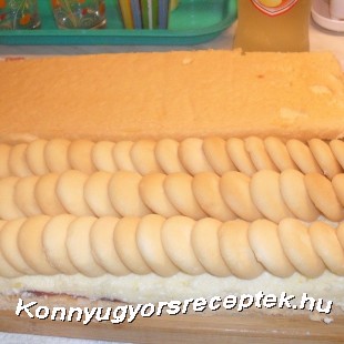 A piskótalaphoz a tojásokat a cukorral habosra keverjük ( kb.10 perc), majd apránként hozzákeverjük a sütőporos lisztet. Két lapot sütünk, sütőpapírral bélelt nagy gáztepsiben.180 C fok, kb. 10 perc.