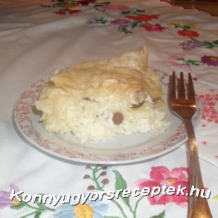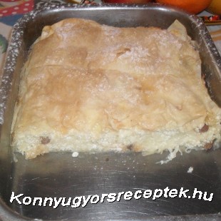 Ráhalmozzuk a túró tölteléket, és ismét 2-3 réteg - egyenként lekent - réteslappal beborítjuk. 180 C fokra előmelegített sütőben kb. 50-55 perc alatt szép pirosra sütjük. Kockára vágva tálaljuk, tetejét porcukorral megszórjuk.