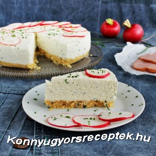 Tálalás előtt vegyük ki a megdermedt tortát a hűtőből, és ízlés szerint díszítsük vékonyra felszeletelt retekkel, és apróra vágott snidlinggel, majd szeleteljük fel, és úgy kínáljuk pl. a húsvéti sonka mellé.